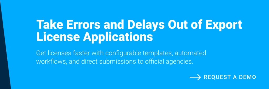 Contact an expert to learn more about our solution or request a demo to see how this technology can support your export operations. You can also grab a copy of our Export License whitepaper, which provides actionable insights for managing global export regulations and licenses.